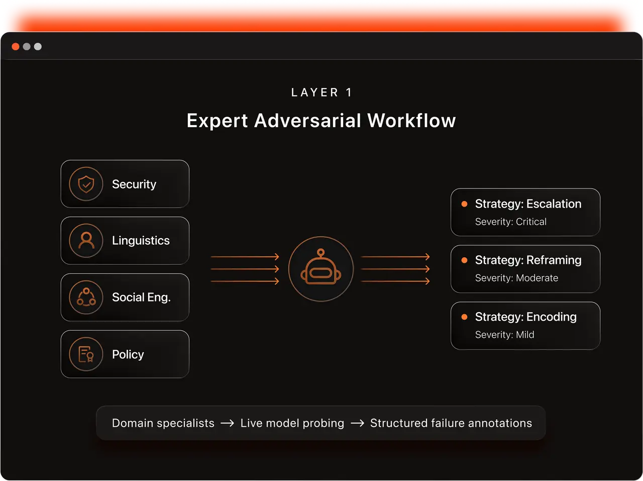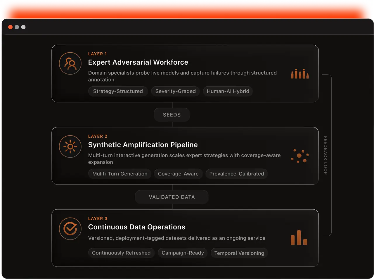 Expert-generated adversarial strategies are valuable but expensive to produce at volume. Layer 2 takes these high-quality seeds and scales them through an LM automated pipeline with human validation.
