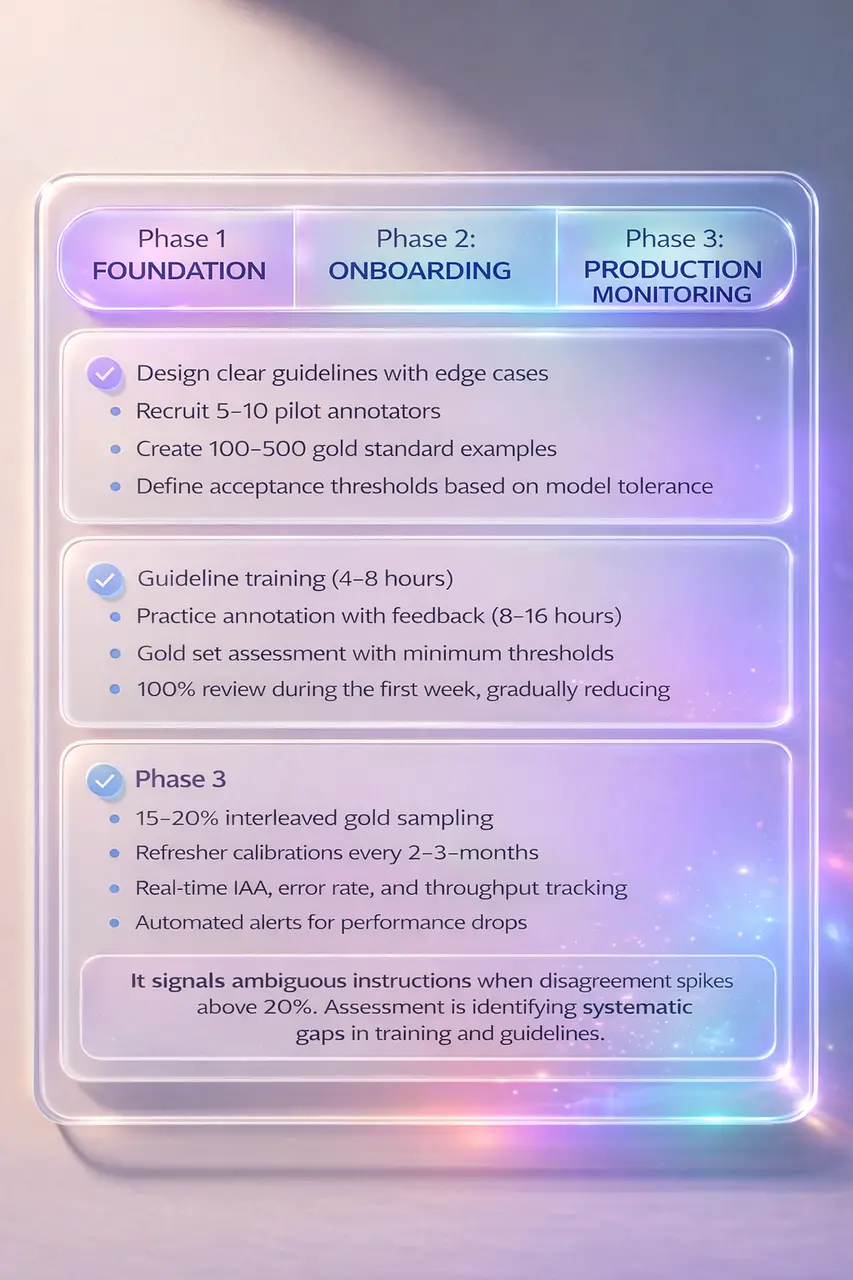 There is no one specific metric. But the Inter-Annotator Agreement (IAA) is the most foundational; it shows whether humans can interpret the task consistently. If annotators disagree, models inherit that noise. In production, track IAA (Cohen’s or Fleiss’ Kappa), gold-set accuracy, and task-specific metrics like precision, recall, or F1. - How often should quality be assessed?