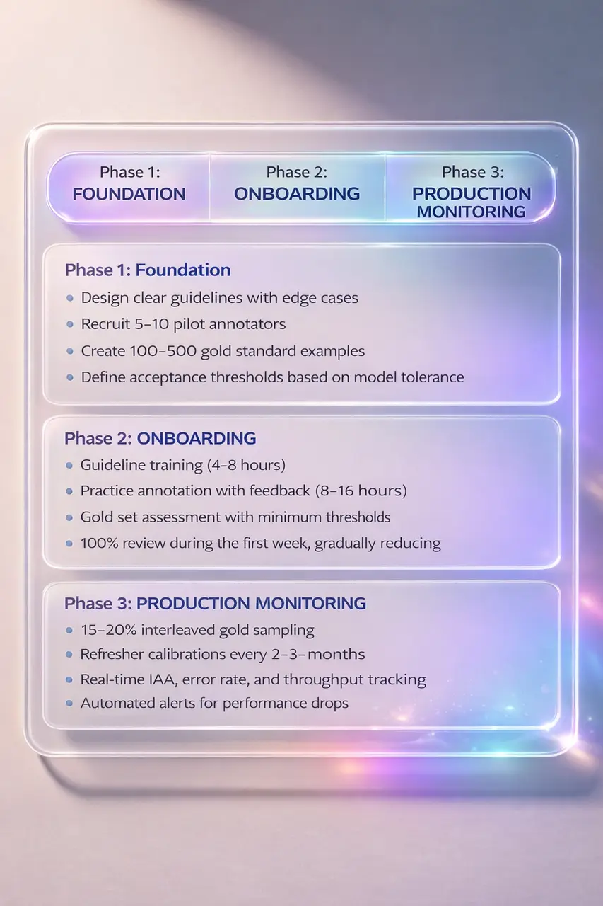 Evaluation measures consistency, accuracy, and guideline adherence. It checks whether labels match ground truth, whether annotators interpret instructions uniformly, and whether edge cases are handled correctly. In practice, this includes IAA scoring, gold-set validation, error categorization, and feedback loops to refine both instructions and workforce performance.