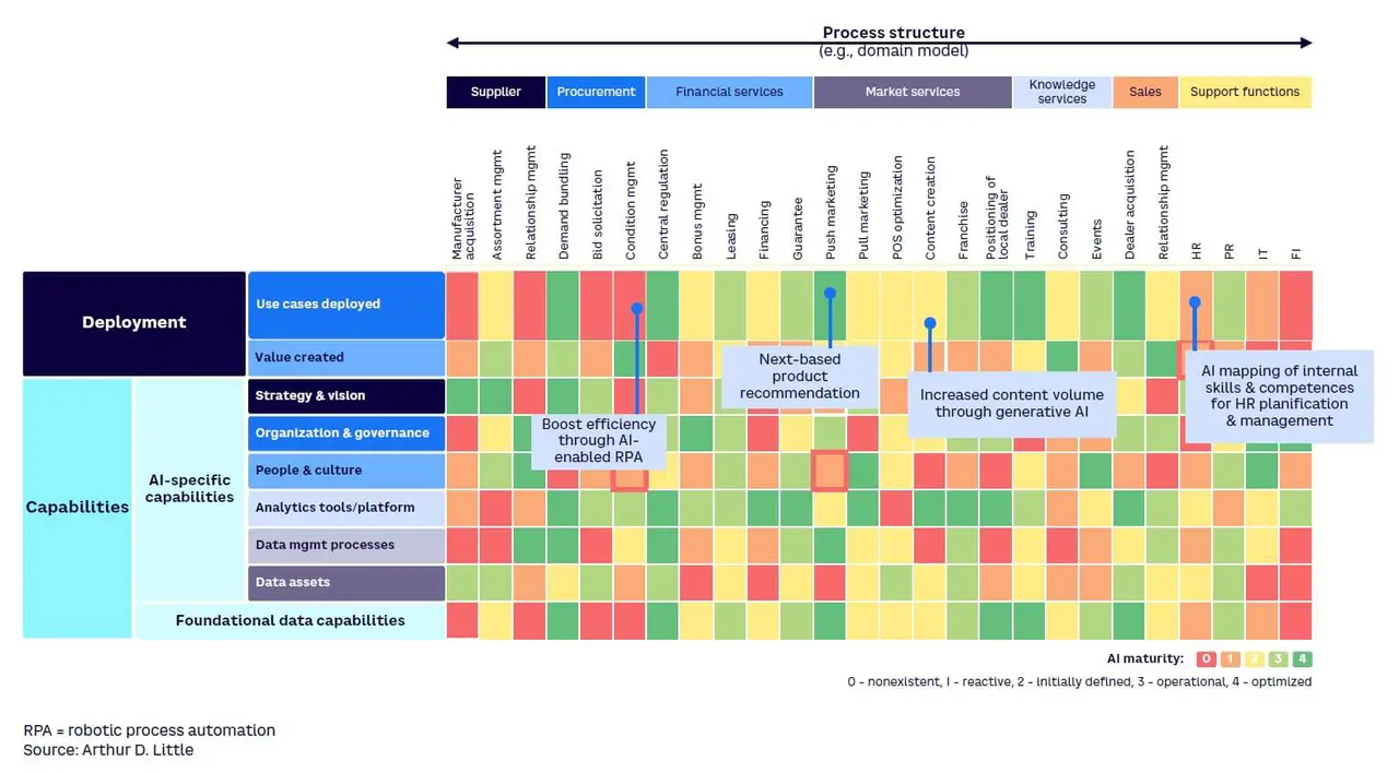 - A growing share of value is coming from embedding AI into specific workflows (claims handling, procurement, underwriting, maintenance, and close process), not from generic chat interfaces. This aligns with the broader "rewiring" theme emphasized in McKinsey's 2025 findings.
