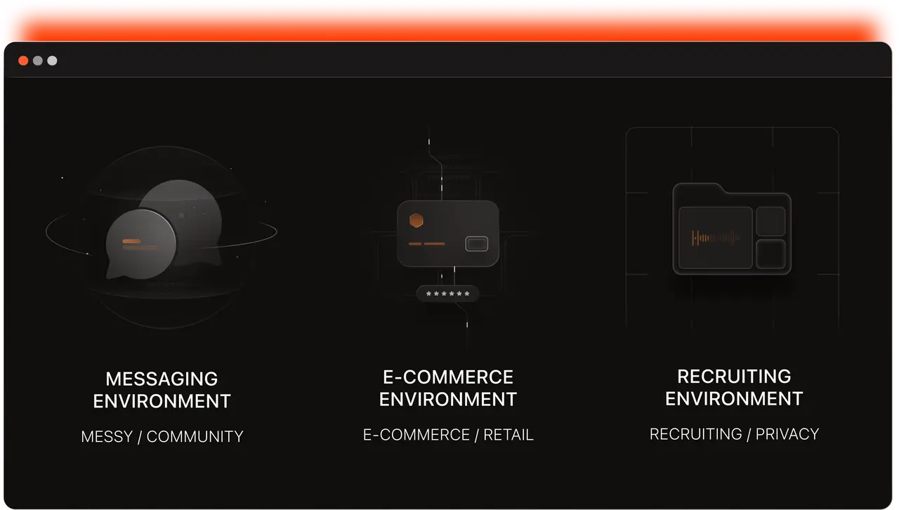 Recruiting Environment — Structured & Sensitive. A recruiting pipeline built from de-identified internal candidate data. Agents manage job postings, candidate stages, and interview scheduling with strict privacy controls.