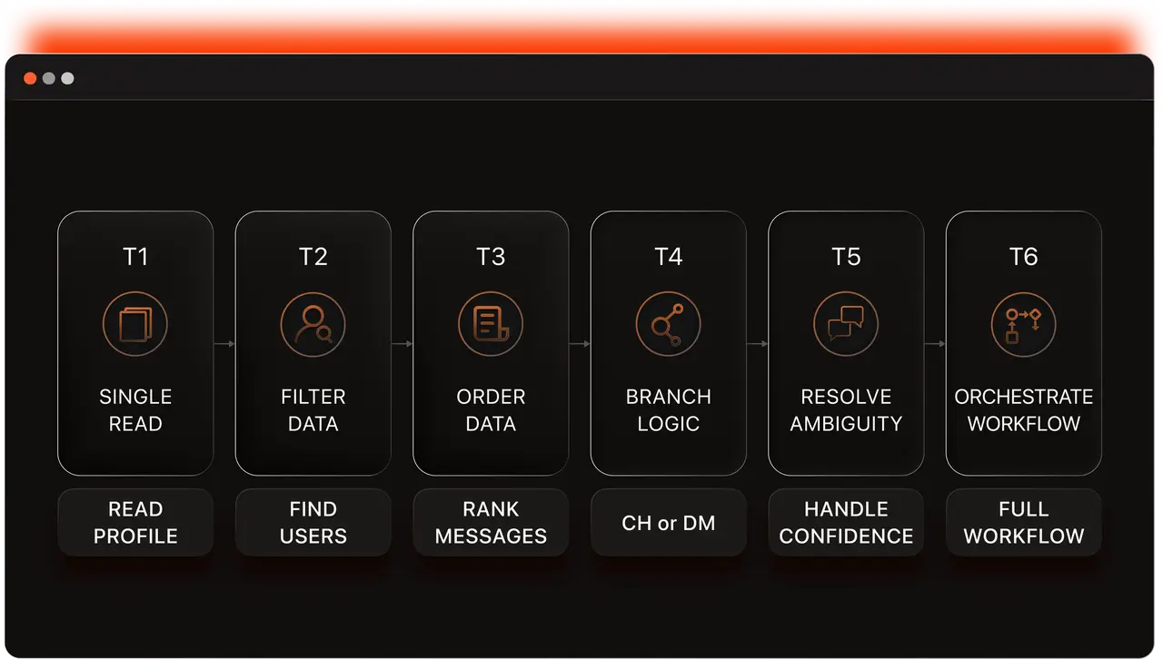 We designed a six-tier task complexity framework that serves as the structural backbone of our task distribution. Each tier maps to distinct cognitive demands an agent must exhibit, from simple retrieval to long-horizon orchestration under ambiguity.