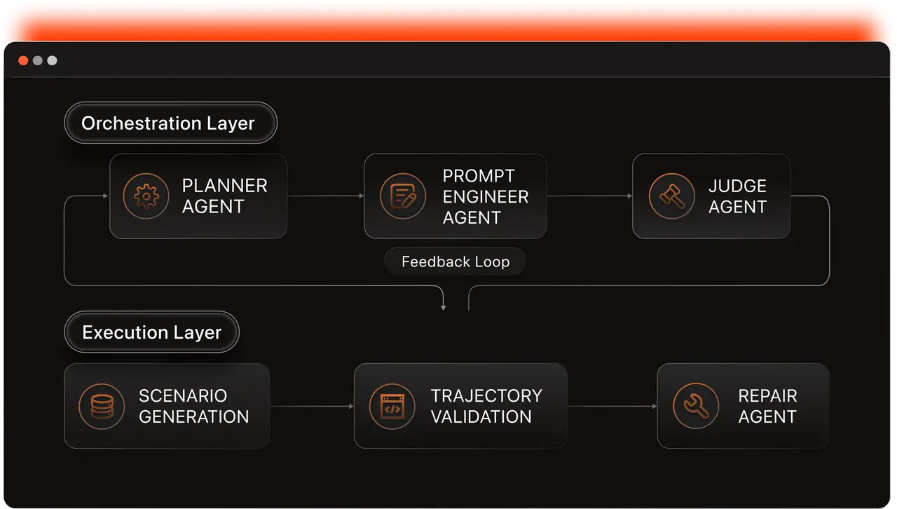 This is not just naïve prompt templating. We built a multi-agent pipeline that enforces quality, diversity, and correctness at every stage.