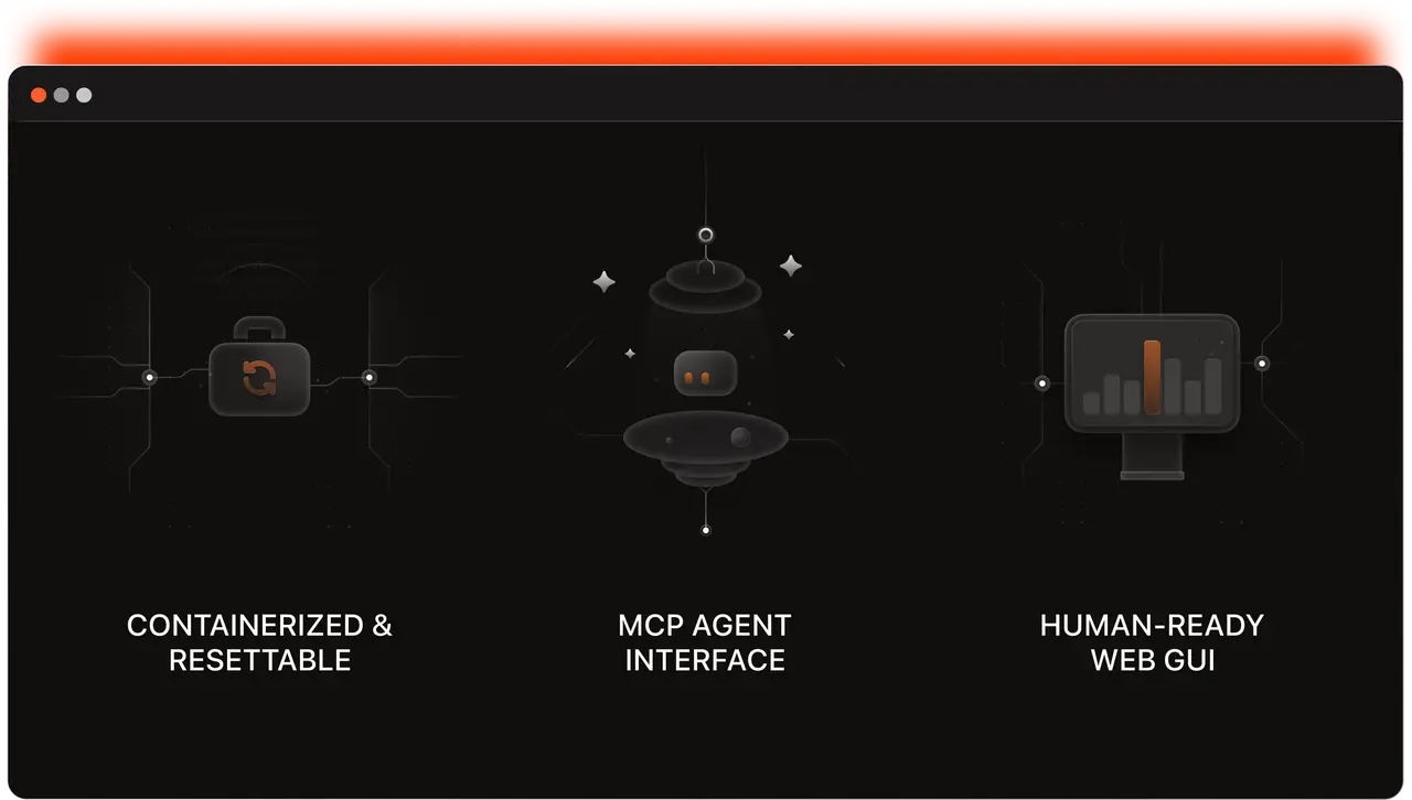 Each environment is fully sandboxed, deterministically resettable, and exposes both a web GUI and a complete API/tool interface compatible with MCP-based agent runtimes.