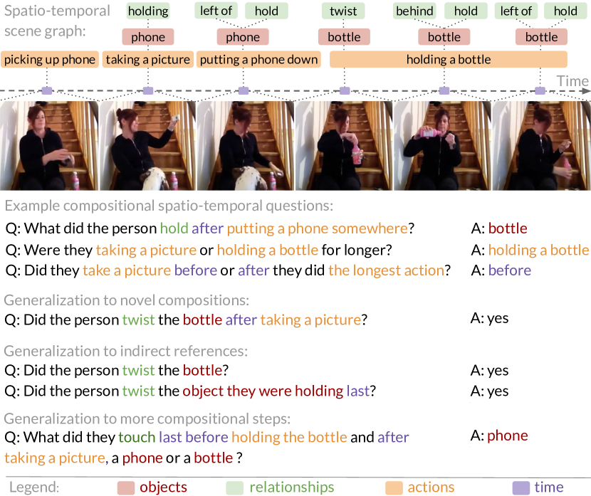 - Description: The research team collected a large number of diverse videos from the internet, covering various real-life scenes and events, such as family activities and outdoor sports. AGQA creates questions through a combination of manual annotation and automatic generation. These questions are designed to test the model's understanding and reasoning capabilities regarding video content, including inquiries about actions, events, objects, attributes, and more, such as "What did the person in the video do before opening the door?" The questions in the AGQA dataset are highly complex and diverse, requiring models to possess strong logical reasoning and language comprehension abilities to answer accurately. It covers multiple semantic types of questions, such as causality, temporal order, and action intent, providing rich material for researching the reasoning capabilities of videoQA systems. Additionally, the dataset offers detailed annotation information, including question categories and answer types, facilitating in-depth analysis and evaluation of model performance by researchers. This contributes to advancing video understanding and question answering technologies, enabling models to better handle complex real-world video content comprehension tasks.