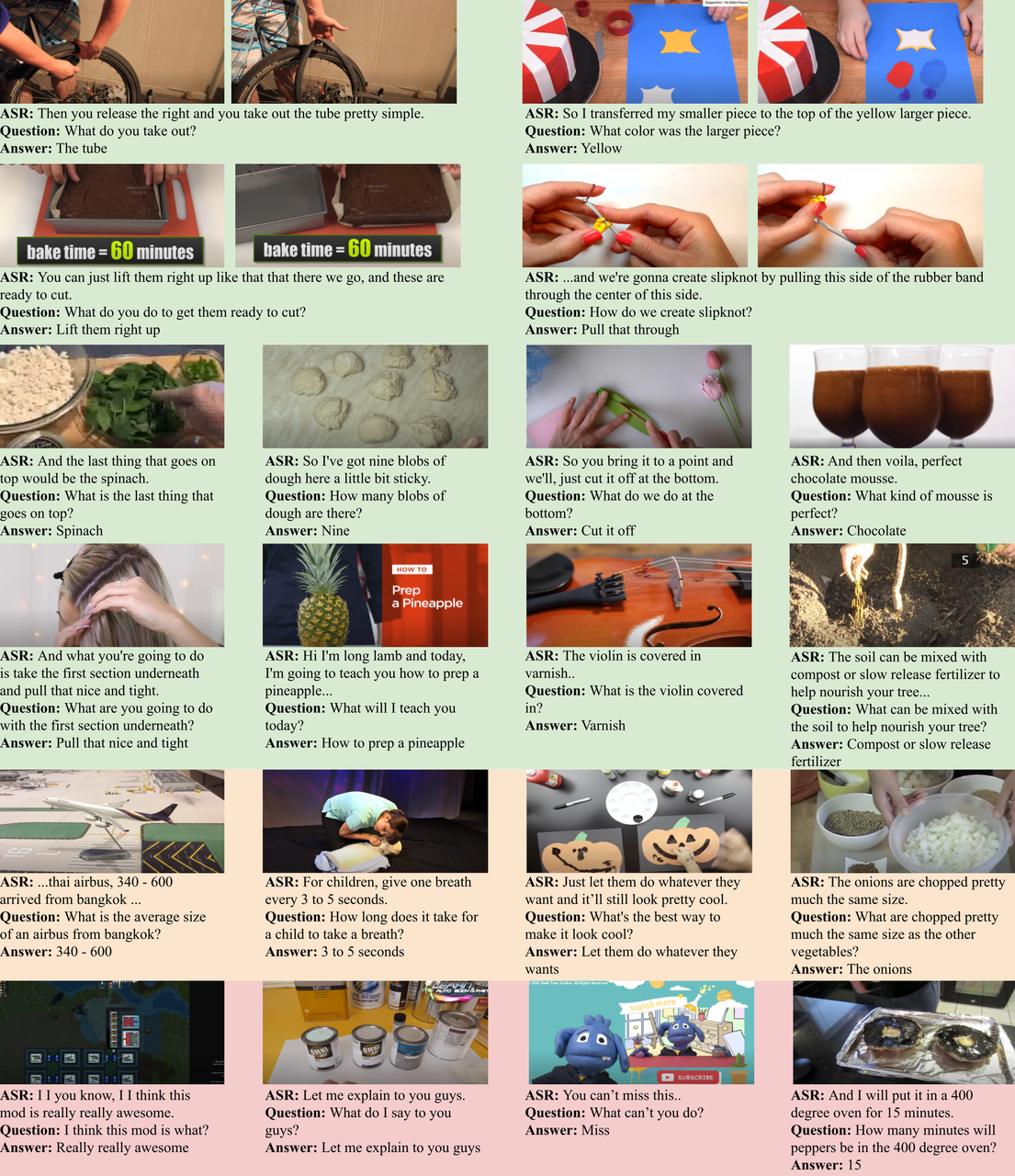 - Description: The research team collected a large amount of video data from the internet and utilized GPT-4v's visual capabilities to annotate the videos, resulting in 40,000 annotated video clips (totaling 291 hours). Based on this, the dataset was expanded to 69 million entries using a model that automatically generates video descriptions. The questions revolve around various aspects of the video content, including actions, scenes, objects, events, and more. A notable feature of the HowToVQA69M dataset is its massive scale, providing abundant data resources for model training. The generated descriptions include rich world knowledge, object attributes, camera movements, and detailed and precise temporal descriptions of events, which help enhance the model's deep understanding of video content. Additionally, the complexity and diversity of the questions in the dataset are high, covering multiple semantic types such as causality, temporal order, and action intent, effectively advancing the reasoning capabilities of videoQA systems and enabling models to better handle complex real-world video understanding tasks. Furthermore, the dataset's detailed annotation information facilitates in-depth analysis and evaluation of model performance, providing strong support for research in multimodal understanding and generation related to videos.