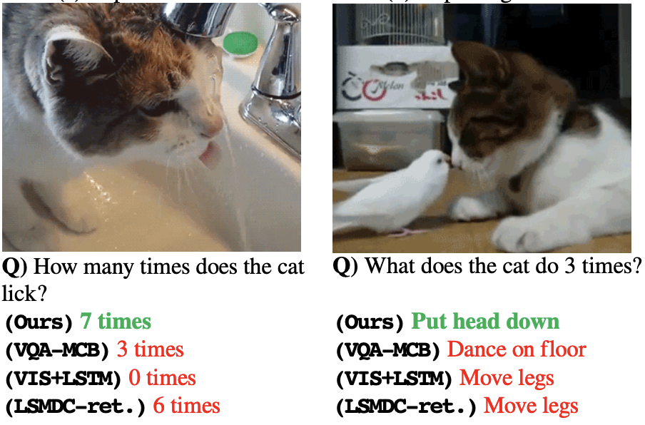 - Dataset Description: The TGIF-QA dataset primarily consists of a large number of short videos in animated GIF format, featuring unique visual styles and content characteristics. It focuses on short videos (primarily GIFs), with question types including action recognition and object localization. Due to the short length and typically simple, intuitive content of the videos, this dataset is highly useful for studying models' rapid understanding and answering capabilities in simple visual scenarios. It also provides suitable training data for developing lightweight and efficient videoQA models, particularly for resource-constrained applications such as videoQA on mobile devices.