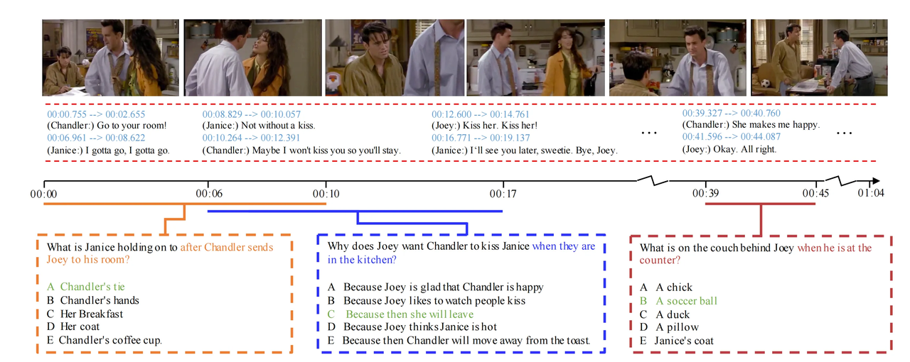 - Description: TVQA contains over 21,000 questions, with corresponding videos sourced from 6 popular TV shows, covering various genres such as sitcoms, mystery, historical drama, and science fiction, featuring coherent storylines and rich character relationships. The questions encompass aspects such as TV show plots, character emotions, and dialogue meanings. Given that TV shows have long narrative arcs and complex character interactions, this dataset is highly valuable for studying the capabilities of generative AI models in long-term plot understanding and question answering. For example, in smart TV interaction systems, users can ask questions about the TV show they are watching at any time, and the model can provide accurate answers based on the plot context, enhancing the viewing experience. Additionally, it offers data support for research on TV show plot analysis and audience feedback prediction.