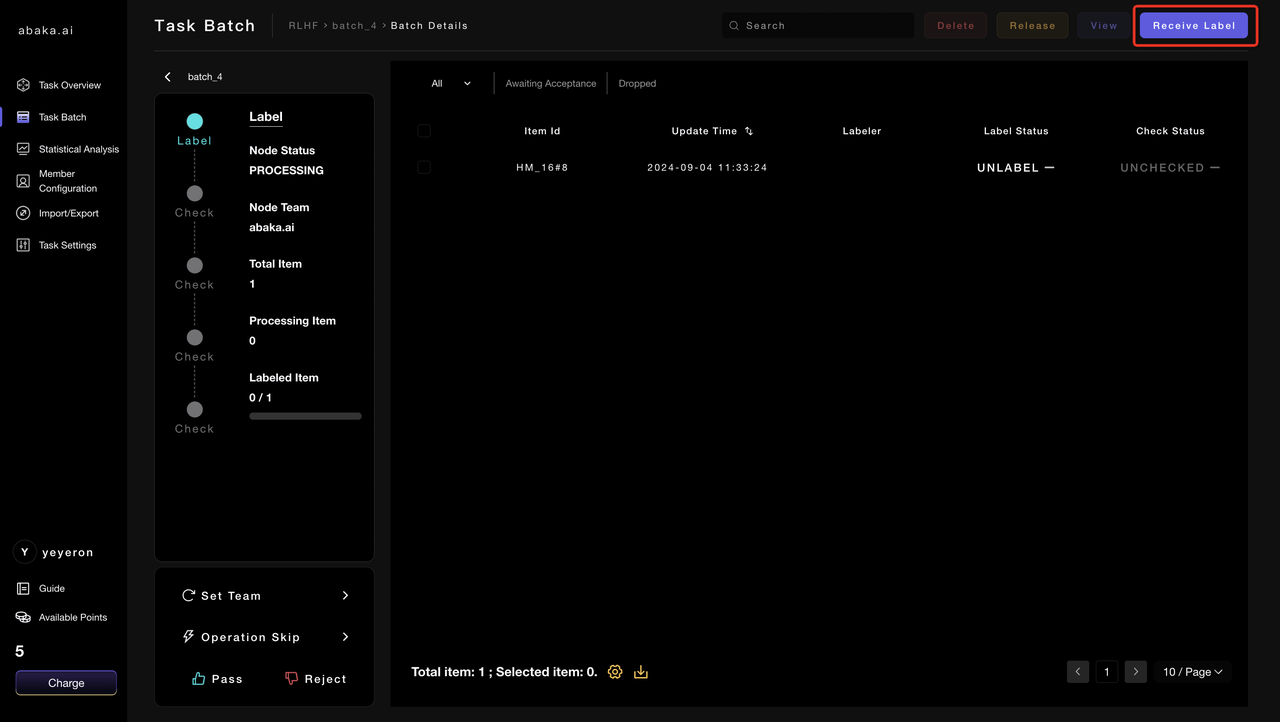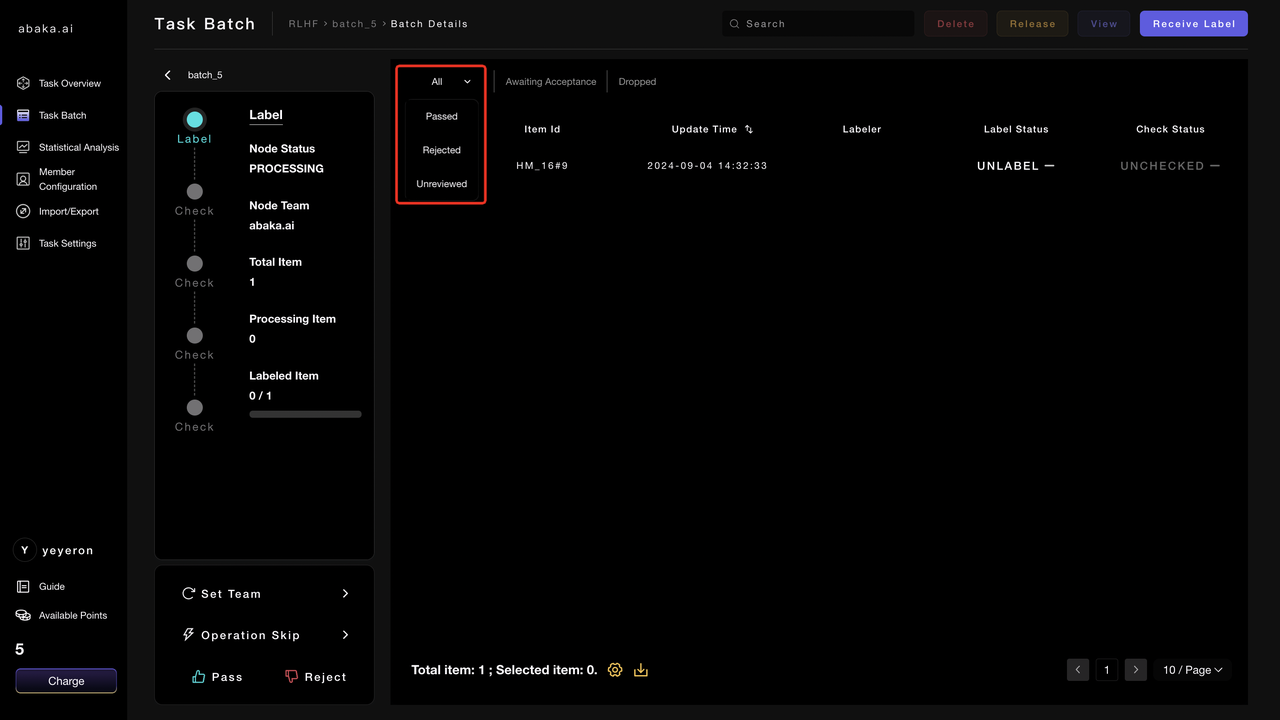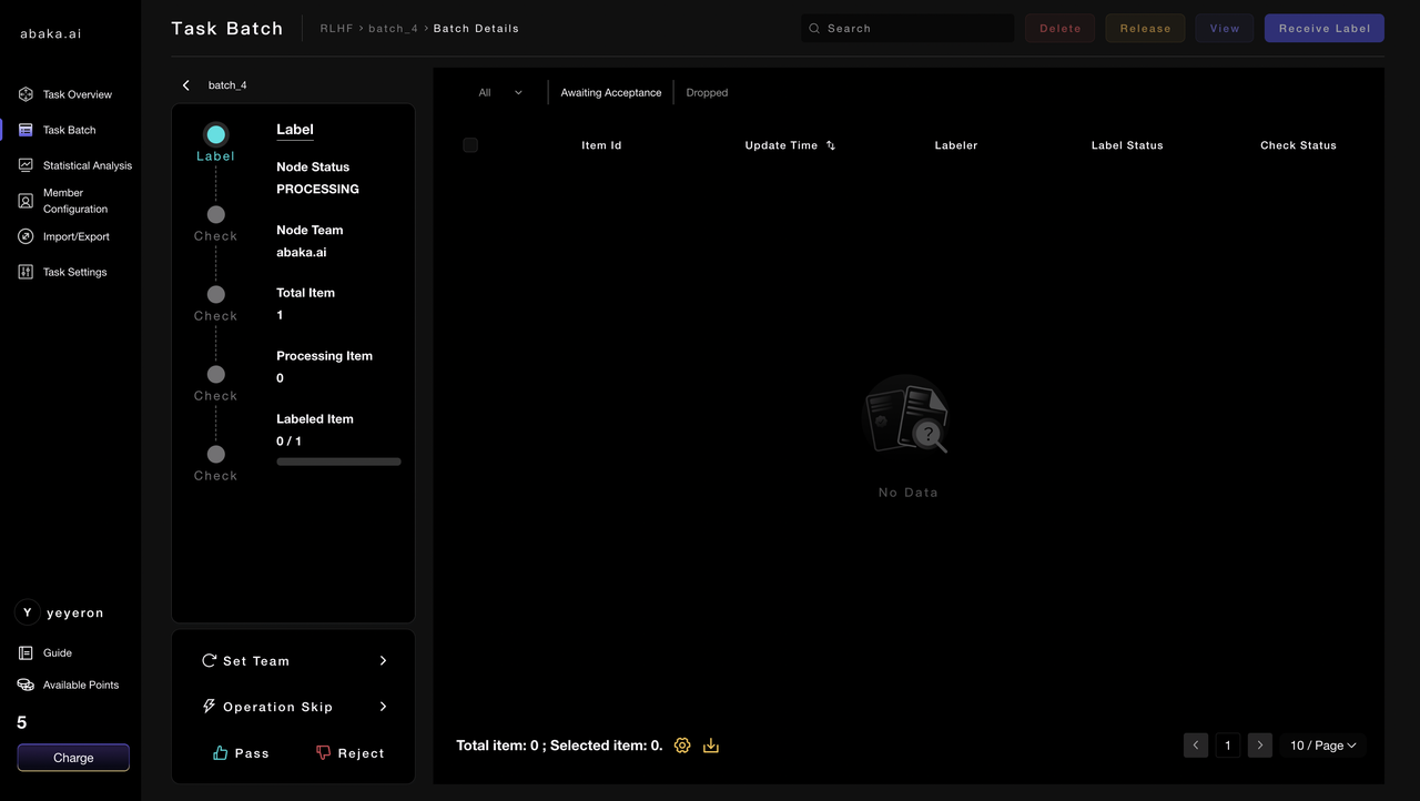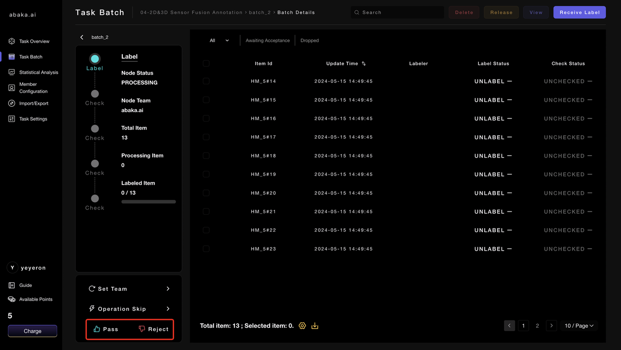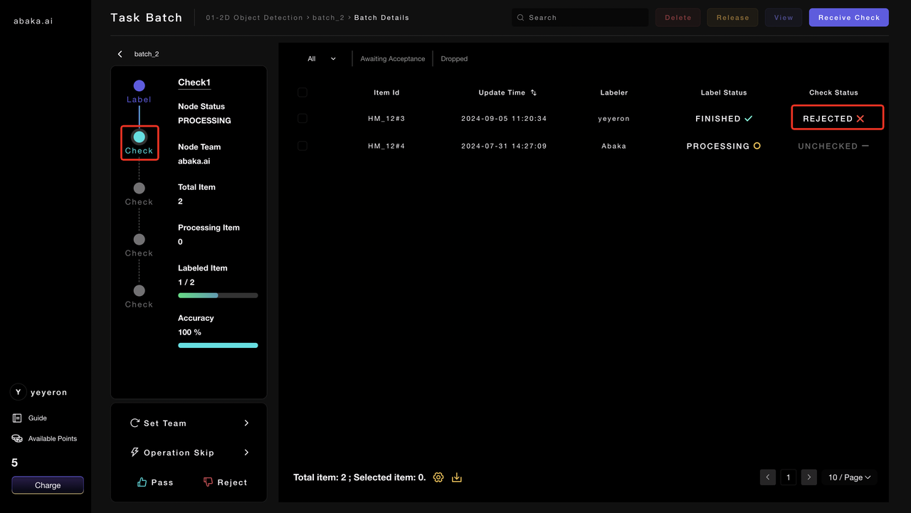 - After reviewing all items in this batch, if you are dissatisfied with the batch data, you can click on “Reject” in the lower left corner to reject the batch back to the labeling node for rework.