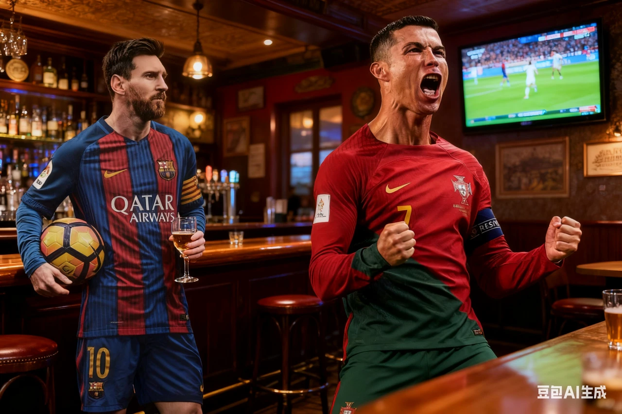 Place Cristiano Ronaldo and Lionel Messi in the same scene. Cristiano Ronaldo is wearing a plain black hoodie with no extra patterns, while Messi is wearing a simple long-sleeved white polo shirt. The two are in a whiskey bar, drinking whiskey together, chatting happily, and watching a football match.